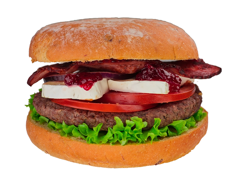 125g Irish-Beef, Cranberries, Salat, Bacon (Hähnchen), gegrillte Tomate, gegrillte Zwiebeln, Blauschimmel-Käse